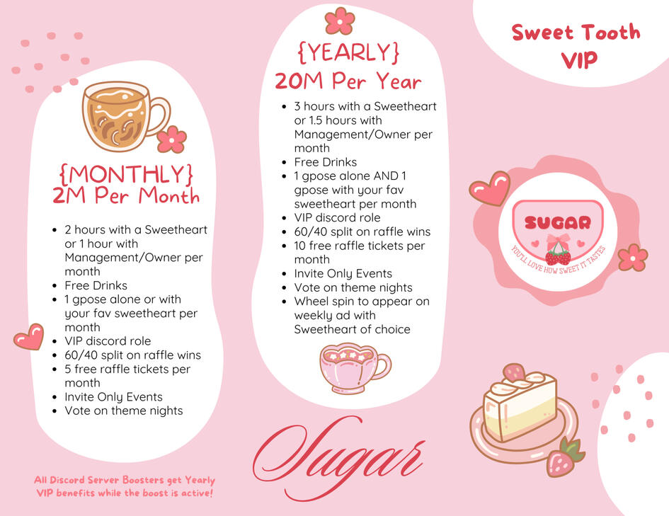 The smell of sweets in the air, a warm glow around you; welcome to Sugar, where sweet dreams meet late-night allure. Every sip, sound, and detail is crafted to satisfy your cravings for something sweet...and maybe a bit spicy too.Whether you're here for company from our Sweethearts or Candy Hearts, or just want to hangout with some lovely people, Sugar is the place for you. Welcome!
