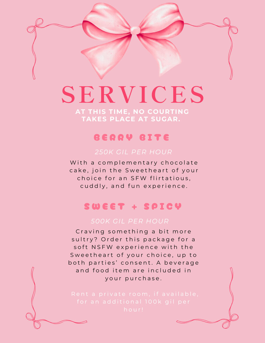Sugar is a venue created with all things sweet in mind; whether you want a tasty drink, snack or one of our Sweethearts (companions), we've got you covered. We strive to bring hospitality to those who need something sugary during the day or sultry in the night. Please do not hesitate to reach out to our staff if you need absolutely anything; we'll make your fantasies come to life and leave a sweet aftertaste on your tongue.